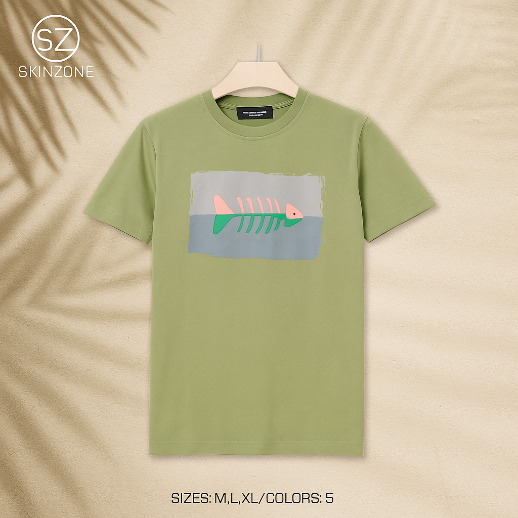 Green Tee With Abstract Fishbone Graphic For A Minimal Artistic Look